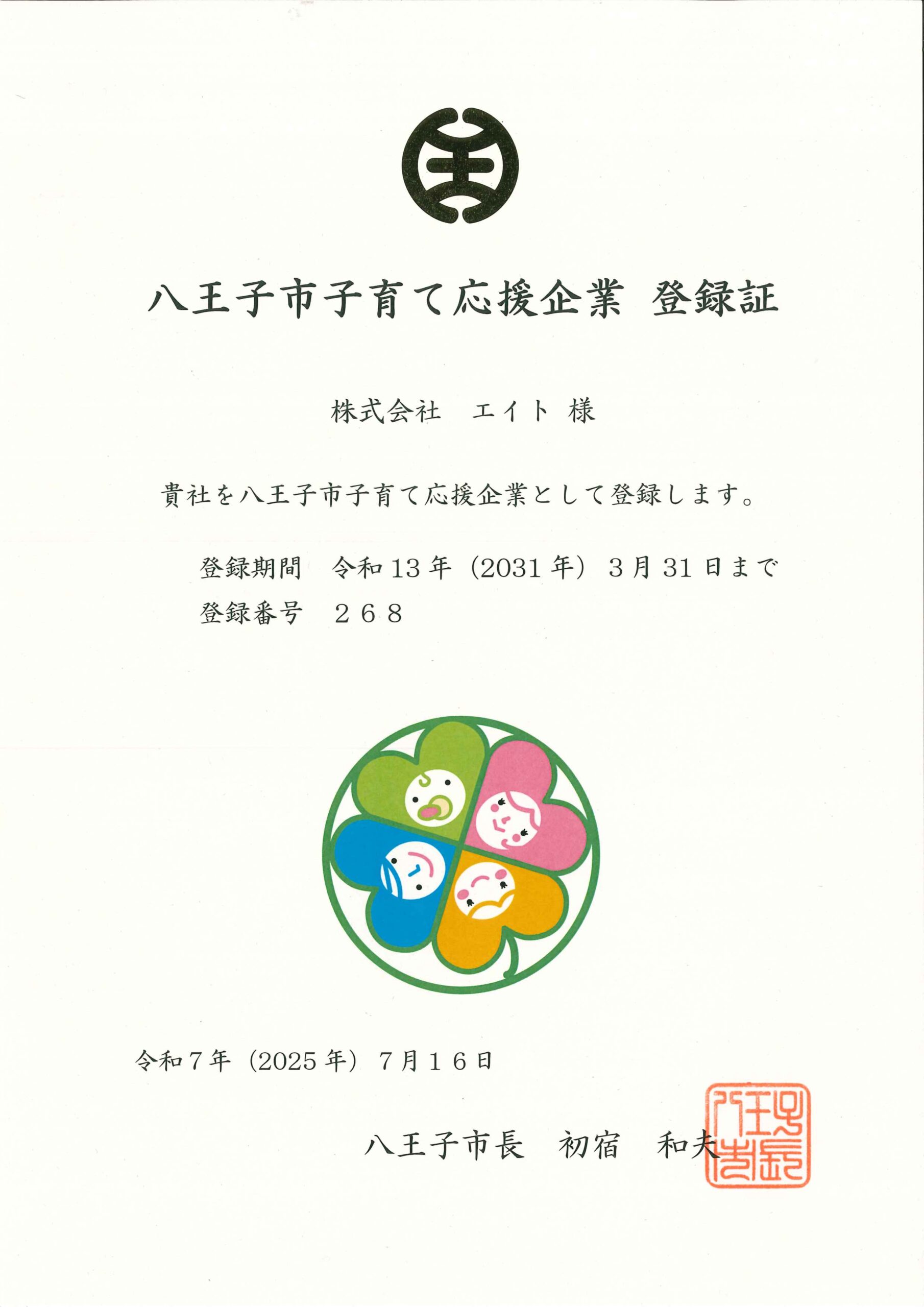 2024年7月16日、株式会社エイトは「八王子市子育て応援企業」として正式に登録されました。
